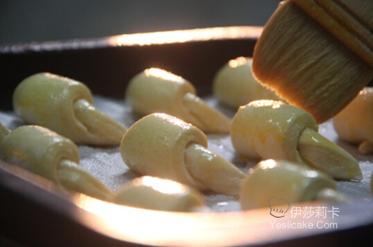 7:将面片取出擀薄,去掉两端边缘,切成三角形,在三角形中间切个口,两手轻压面皮往前卷,收口处朝下放入烤盘,整成牛角形,刷上一层蛋液后进行发酵,发酵至1.5倍大时再刷一次蛋液即可