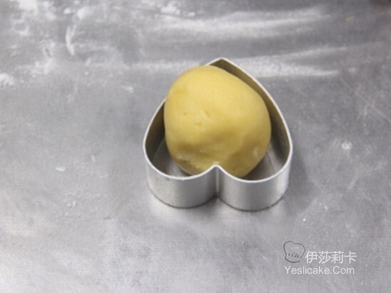 4:根据制作凤梨酥的大小,将面团和馅料按1:1比例称重,取一块面团揉成圆形,用手压扁,放上一块凤梨馅